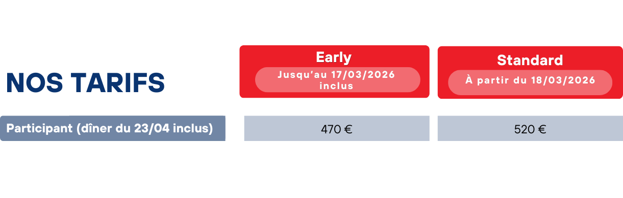 Cancellation conditions: Any modification/cancellation must be communicated by email to participant@15-mai.com :--> Until March 5, 2026 (inclusive): refund of your registration with a deduction of €50 administration fee--> From March 6 to April 8, 2026 (inclusive): 50% deduction from the total amount, for administration fees--> From April 9, 2026: no refund